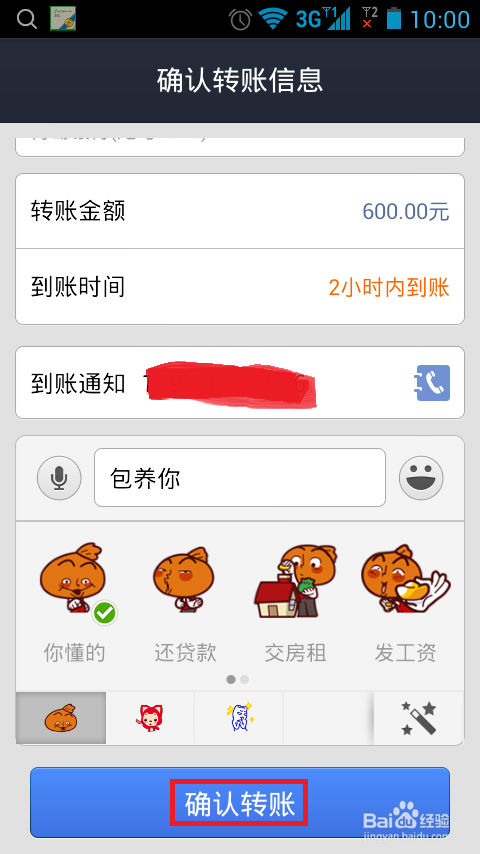 信息核实无误后,在输入框里输入转账客户的手机号码,方便款项到账后短信提醒,还可以附带捎一句话,如果关系不错,可以适当的开个玩笑哦。