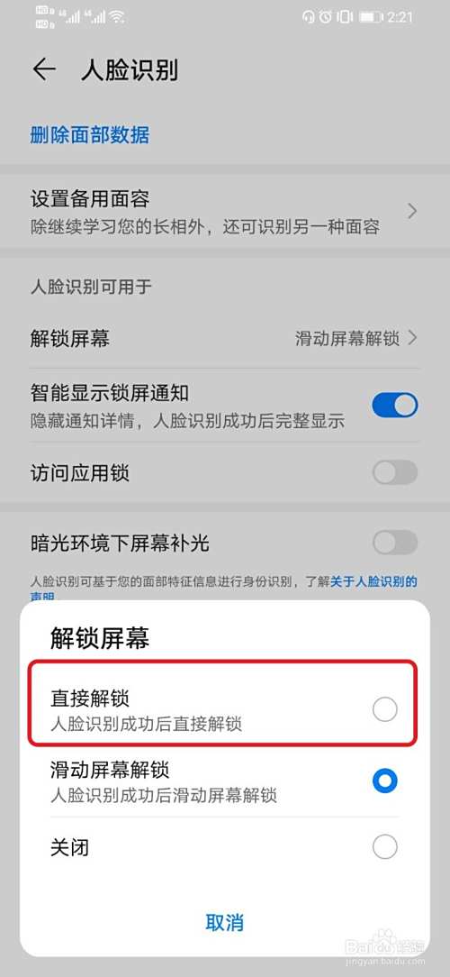 6、点击解锁屏幕功能,选择“人脸识别成功后直接解锁”该功能