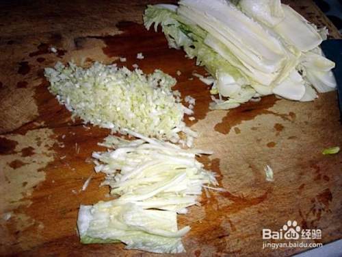 然后把白菜和蒜苗清洗干净,控干水份以后切碎。