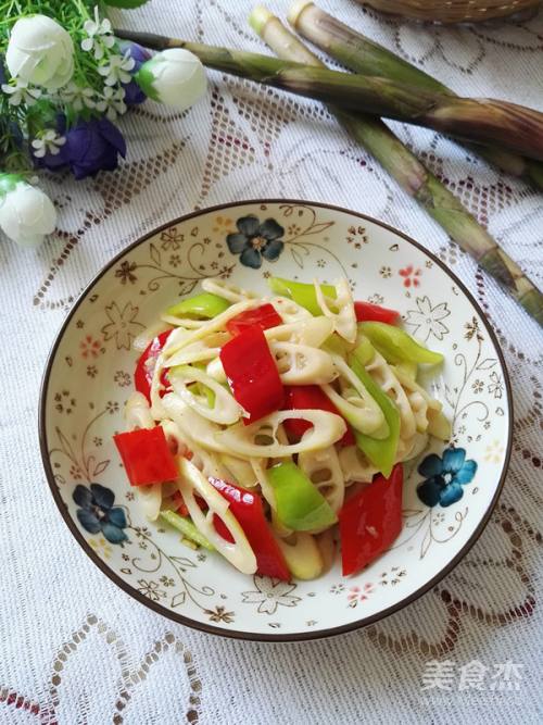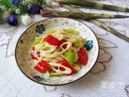 三色春笋,使用了红色的甜椒,稍辣的绿椒,菜品辣中微甜,清淡脆嫩。