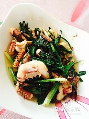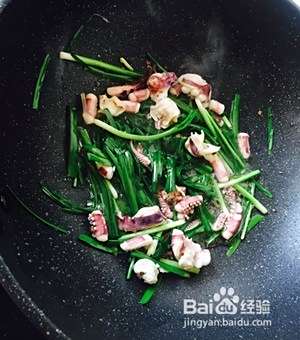 锅中倒油,油温关下火上来下孜然粒,下韭菜和鱿鱼翻炒,放十三香和盐,韭菜变色后就好了!
