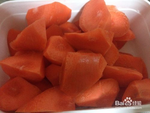 首先,将胡萝卜清洗干净,去皮,然后切成滚块形状,装盘备用。