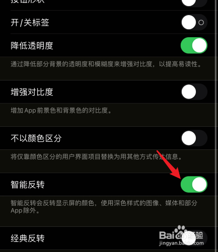 使用苹果6手机时,在辅助功能内选择显示与文字大小的选项,将智能翻转打开后,即可开启深色模式。