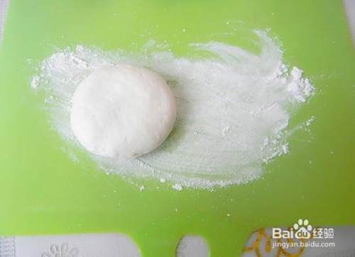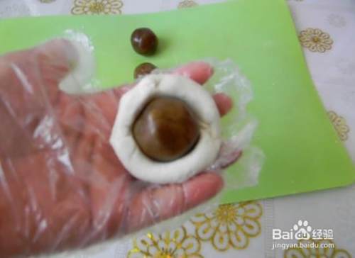 揪下一块面团,面团大约40克左右,团圆在做成碗状,放入豆沙馅,包