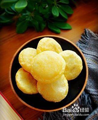 锅放油加热,加热到手放在锅边微微有些热气的时候开始下入炸糕炸,炸到两面金黄就可以出锅了,全程小火,要及时翻动
