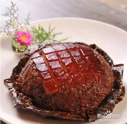 4、取瓷碗,底部刷一层色拉油,五花肉皮朝下摆放整齐,空隙的地方填满炒好的梅干菜糯米饭,荷叶盖在上面,用保鲜膜封好,放入蒸箱蒸制2小时取出,倒扣在盘内。
