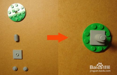 这里,先搭建摇摇马的模型的底座部分,由一个圆形和四个正方形小积木所组成。左边是拼装所需的零件,右边是拼装好后的整体结构效果,如下图所示。