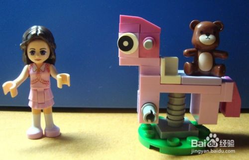 最后,把摇摇马的模型立起来,并摆放配件积木和积木人物,看正面的整体效果,如下图所示。这样就制作好了摇摇马的模型了,大家按照步骤,也来做做吧。