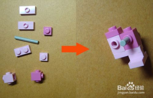 接着,把摇摇马的模型底座和整体部分拼装在一起,左边是拼装所需的零件,右边是拼装好后的整体结构效果,如下图所示。