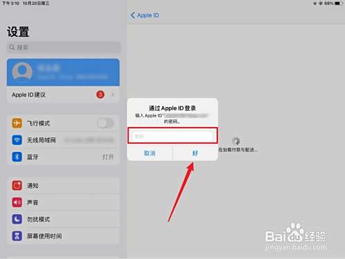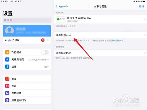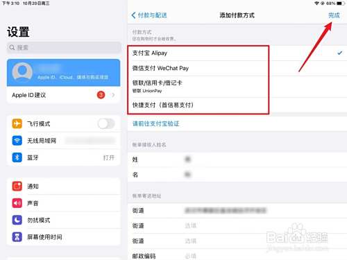 进入ipad,可以点击apple ID,选中付款与配送,输入密码,点击添加付款方式,选择合适的付款方式,点击完成,可以设置付款方式。