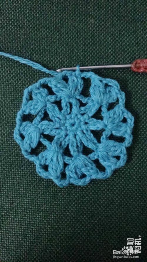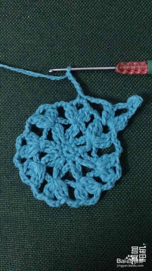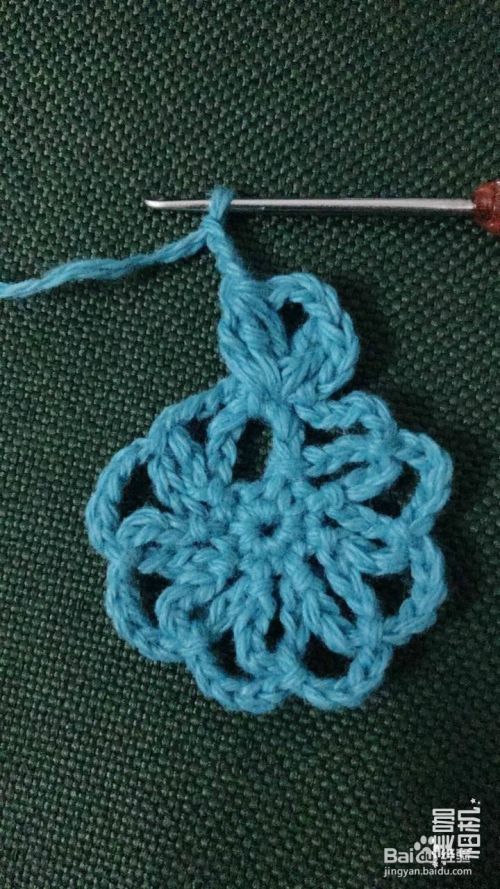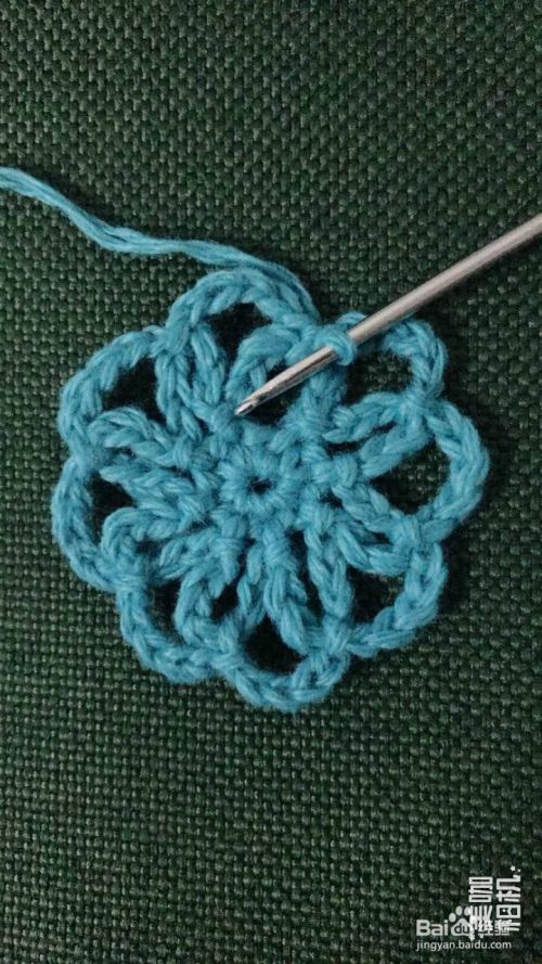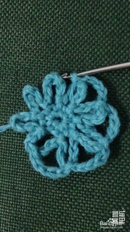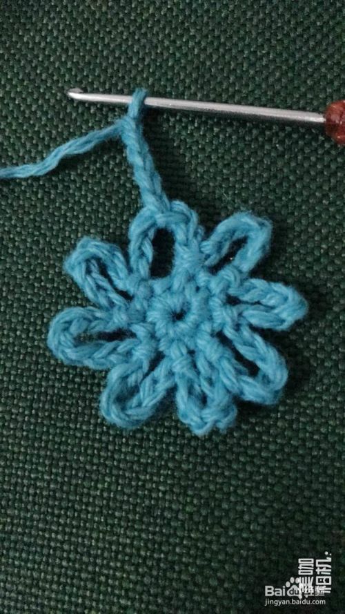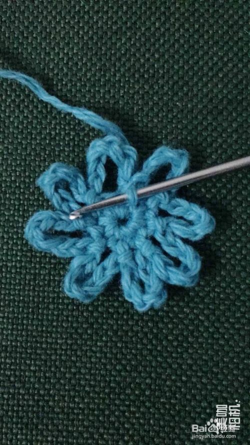 在第一个针孔里面下针拉花8针,紧锁到第二个针孔里面,钩出一个小花孔,按此方法,钩出8个小花孔。