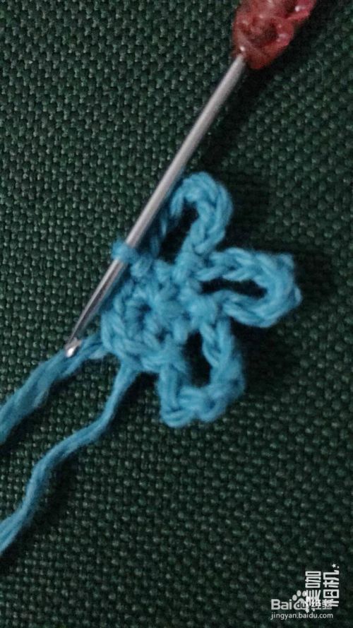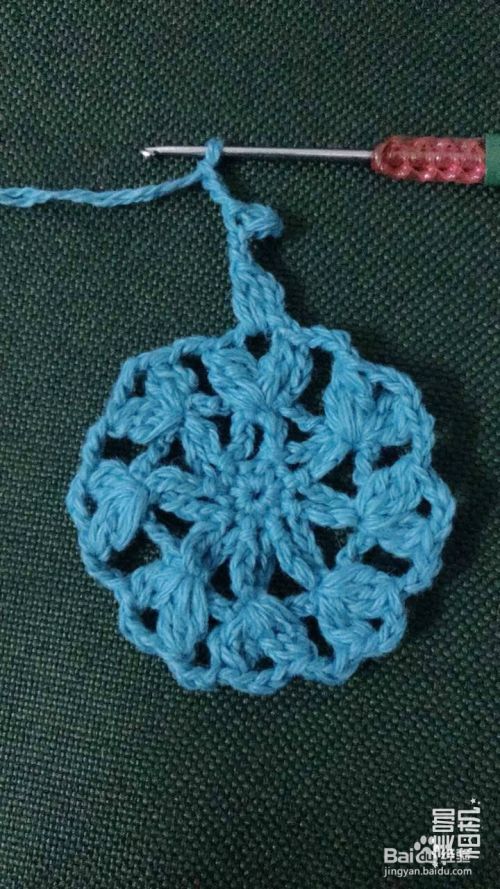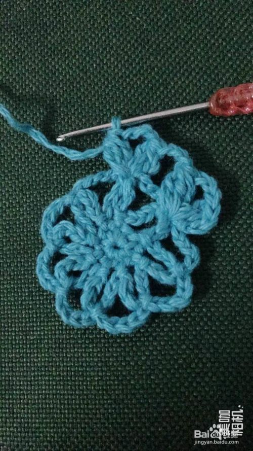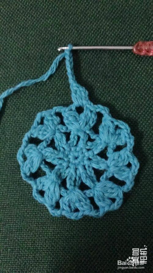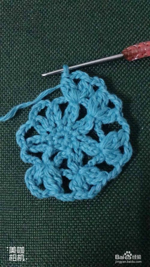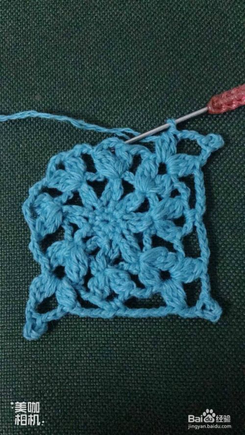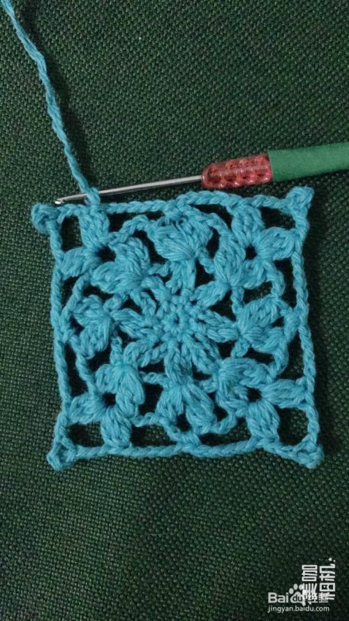 拉花6针,在下一个针孔里面循环上一步步骤,完成1圈,这样漂亮的方形花样杯垫就编织完成了。
