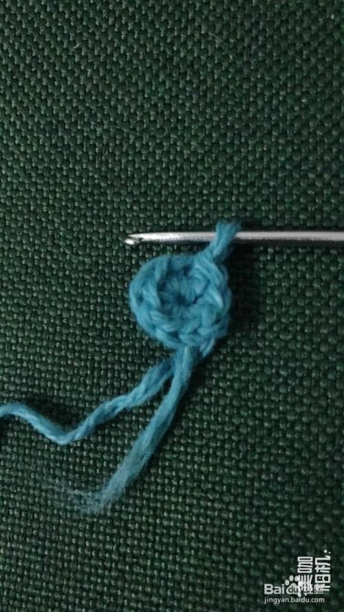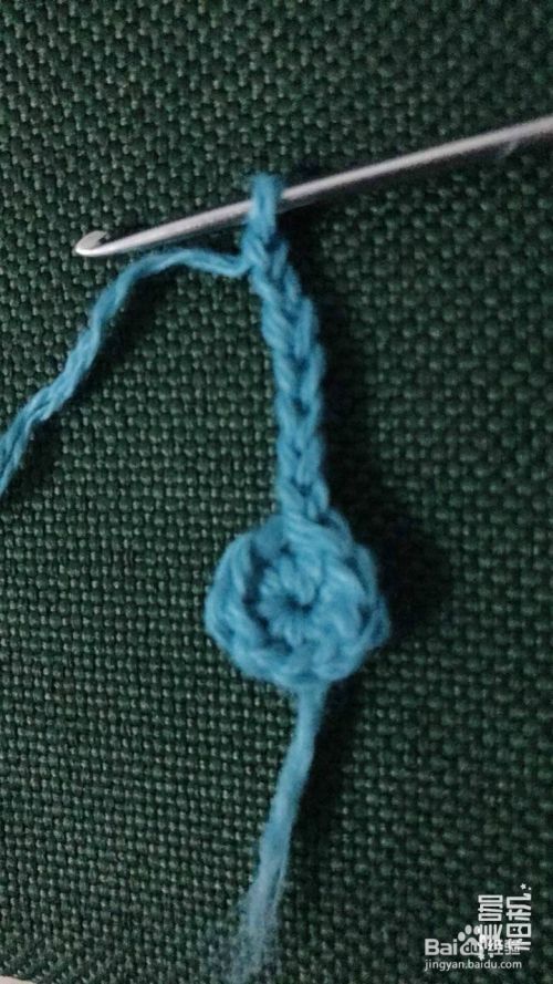先用钩针先钩一个活头结线圈。在活头结线圈里面钩锁针8针,紧锁到第一针锁针的针孔里面,拉紧活头结线圈,形成一个小花心。
