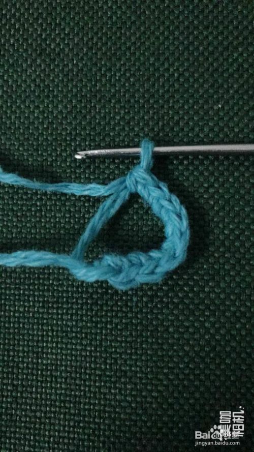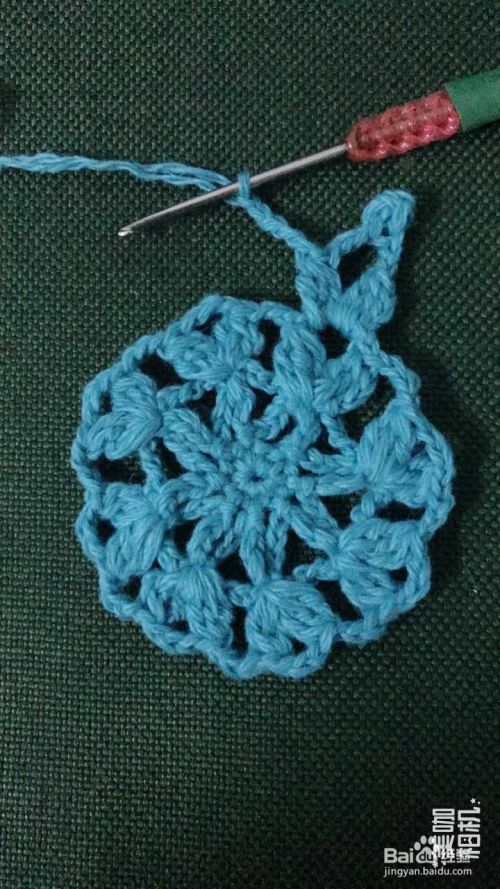 在第一个小花孔顶点出发,拉花5针,紧锁到第二个小花孔顶点处,拉花5针,紧锁到第三个小花孔顶点处,循环,完成一圈。