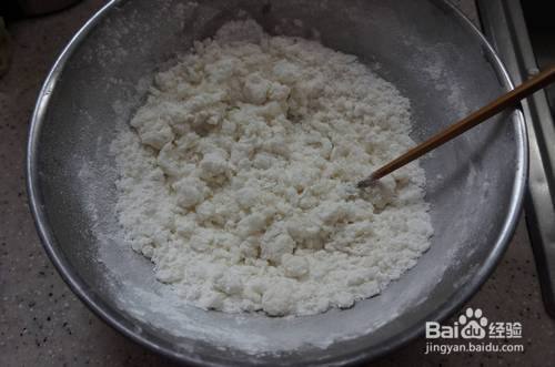 取100克糯米粉、50克粘粉粉、20克澄粉,倒入热开水,用筷子搅成雪花状;