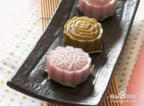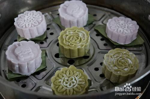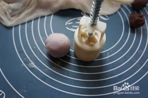 月饼模子里洒上高粉(高粉的作用是保证好脱模),再把搓好的团子放入,用力一按,脱模即可;
