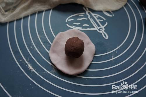 取一个分割好的小剂子,按扁,捏成圆形,把揉好的圆豆沙馅放在中间;