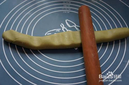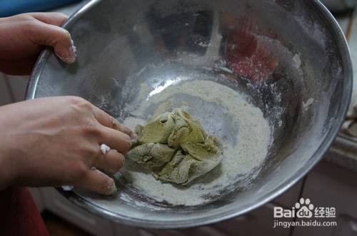 剩余的80克糯米粉和抹茶粉加入盆中,再放入揉好的烫面团,继续用手揉,直到揉成团;