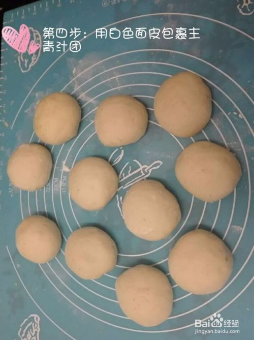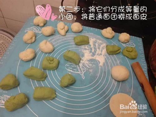 将青汁面团分成等量的小面团,而白面团分成小份,擀成面皮