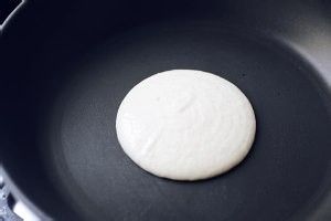 不粘锅用厨房纸擦薄薄一层油,肉眼看不到油痕的量就可以了。裱花袋剪小口,在锅中间挤出松饼的形状。