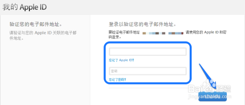 然后会自动跳转到苹果的 Apple ID 验证页面,在验证页面输入之前注册的 Apple ID 邮箱地址和注册时的密码,点击“验证地址”按钮,如图所示