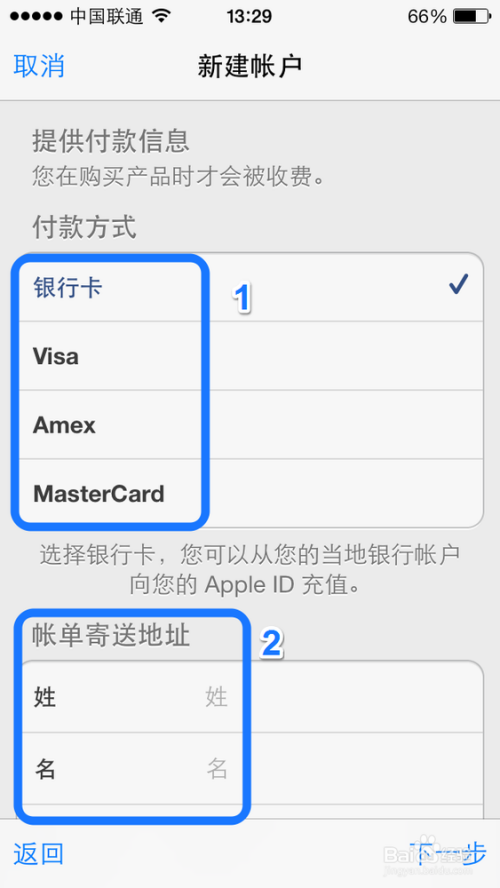 接下来需要提供付款信息,这里选择银行卡为例,然后再输入自己的姓和名,如图所示