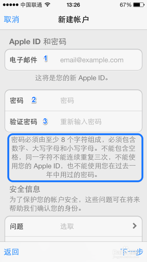 用手指在屏幕上向上滑动,接着填写安全信息,即常用的问题和答案。这个功能的作用是当我们忘记密码时,可以用这些事先设定好的问题来重置密码。问题和答案填好之后,再填写一个救援电子邮件,以防用于 Apple ID 的电子邮件不可用时的备用方案。