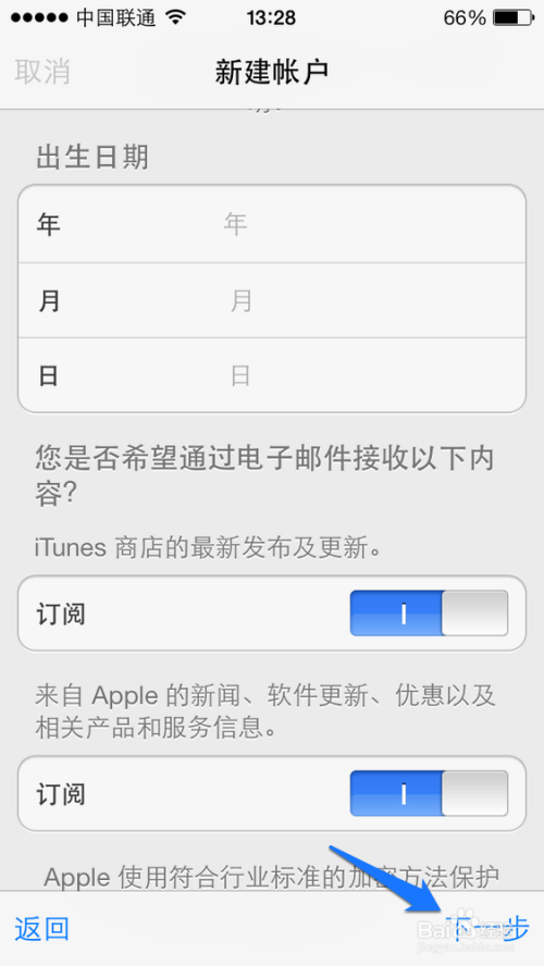 然后填写自己的出生年月日,好了之后,点击右下角的“下一步”按钮,如图所示