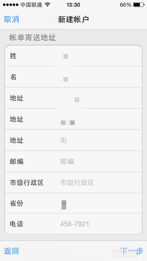 用手指在屏幕上向上滑动,接着填写账单寄送地址,填写好后点击“下一步”按钮,如图所示