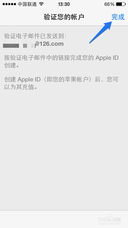随后显示注册成功,并提示我们前往我们用于注册 ID 的邮箱,验证这个 Apple ID。点击右上角的“完成”继续,如图所示