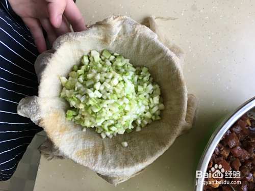 用纱布或者其他干净的布给西葫芦沥水,攥一下,因为西葫芦很嫩很容易出水。将攥好的西葫芦放到之前拌好的肉丁里。