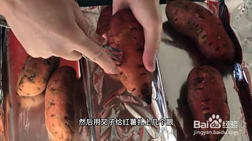 泡好后擦干净放进烤盘里,然后用叉子给红薯扎上几个眼,可以让红薯透气,然后放进烤箱里烤。
