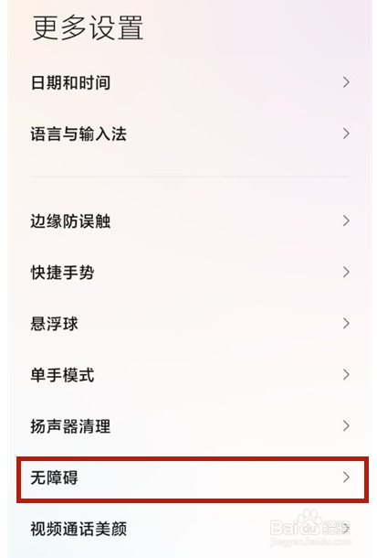 下拉页面找到无障碍,点击无障碍