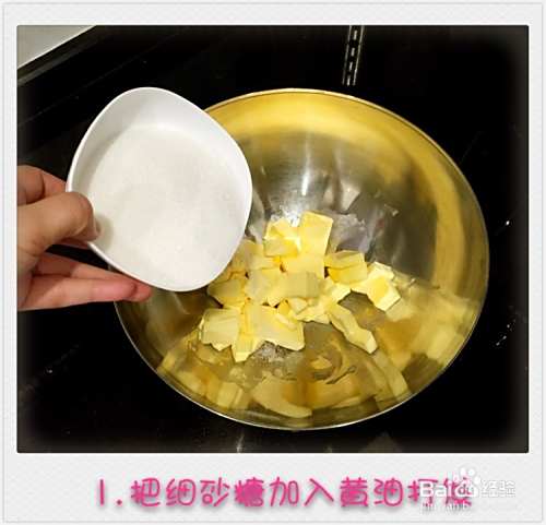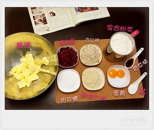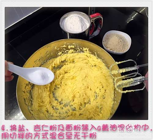 将盐、杏仁粉及高低筋粉筛入黄油内,用刮刀以切拌的手法将所有材料混合至无干粉