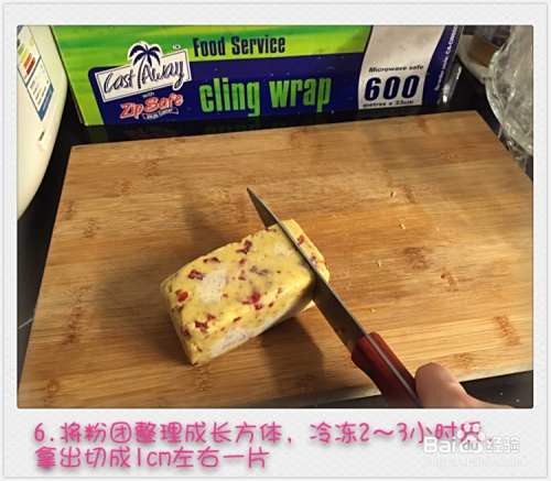 用保鲜膜将粉团整理为长方体,放入冰箱冷冻2~3小时后,拿出切成1cm左右一片