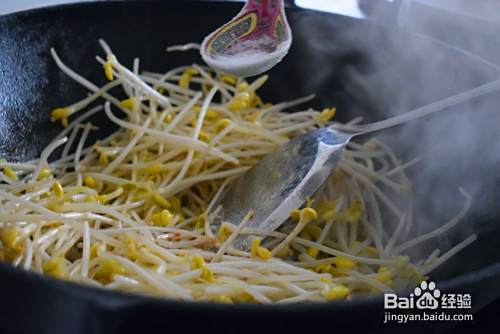 继续翻炒锅里的黄豆芽,中间放一些盐进行调味。