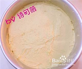 六寸蛋糕模四周和底部刷上些黄油防粘.把蛋糕糊装入模具中.....上面用刮刀刮平....