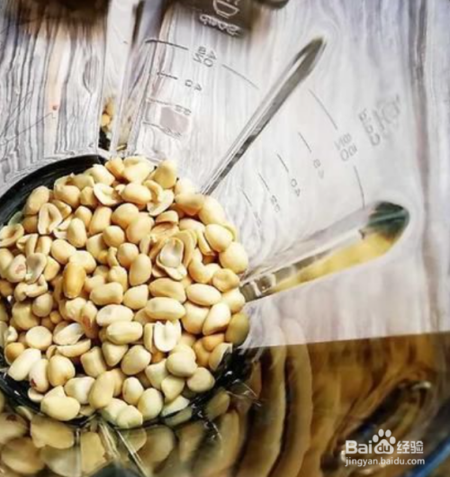 第六步,将熟花生仁拿出,准备10g细砂糖,20g熟花生油。将花生仁倒入搅拌机,通上电源,由低到高慢慢加档。