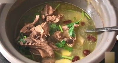 放入姜片、冰糖、大枣、葱段,盖上锅盖,小火慢炖一小时。