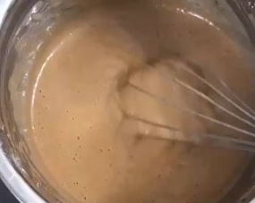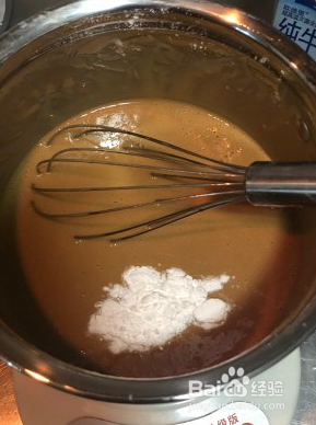 加入60克余下牛奶,打入兩只鸡蛋攪拌均匀,筛入100克低筋面粉,搅拌順滑无颗粒,搅拌过程以防面粉起筋,力度不宜过大,材料必须完全溶合,搅拌5-8分钟。