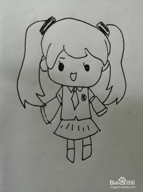 第七步,最后把可爱的小女孩的两只腿画出来。简笔画可爱的小女孩就画好了。