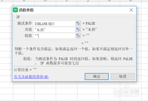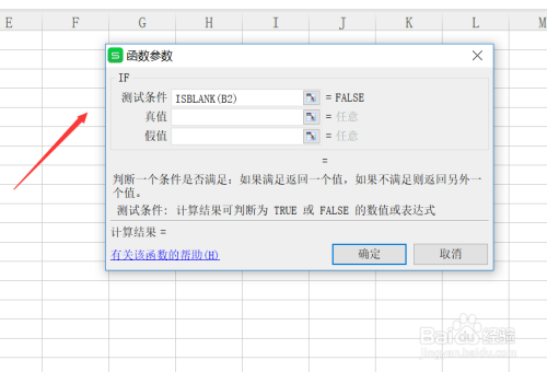 4弹出函数参数设置框,我们在”测试条件“处输入”ISBLANK(B2)“,(注:ISBLANK函数是测试单元格是否为空值);
