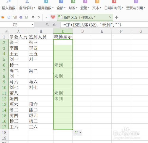 6点击确定后,我们在将鼠标按住单元格右下角向下拖动,这样excel就会自动判断未签到人员,并显示”未到“。  END END