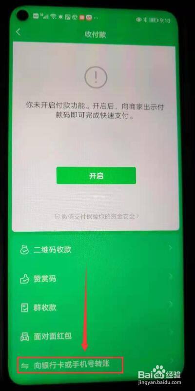 在收付款页面,往下滑动,在最下方,点“向银行卡或手机号转账”;