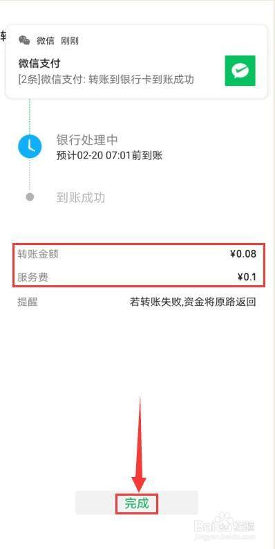 进入支付成功页面,收取0.1%服务费,单笔最低0.1元,点击“完成”。