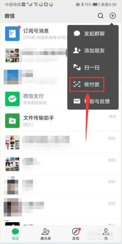 进入微信首页,点击右上角"+"号;