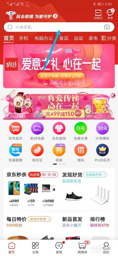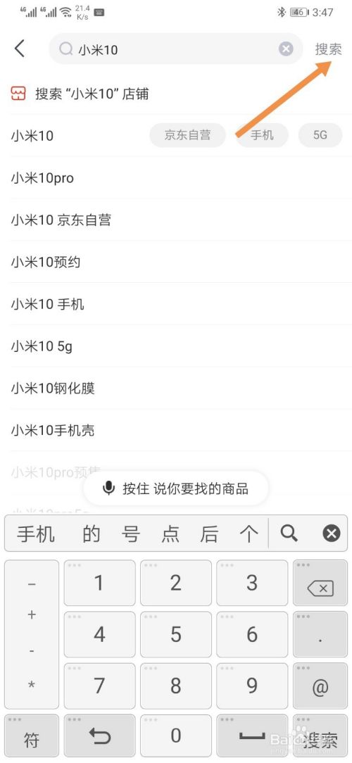 进入搜索界面后,输入小米10,输入完毕后,点击搜索图标。