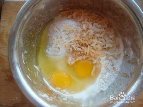 将面粉鸡蛋和虾皮放在盆中。