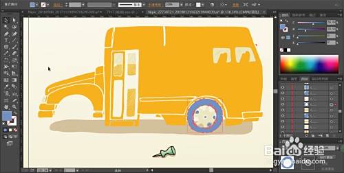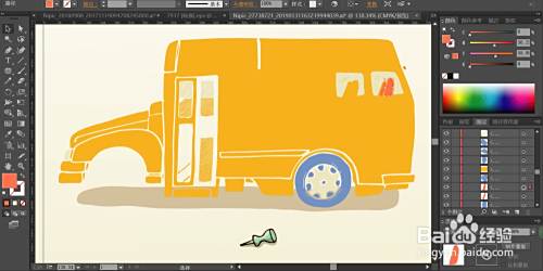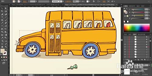 把车体所在的图层放在最后面,让窗口与座位呈现在车体图层的上方。接着,我们再用钢笔画出校车的轮胎,轮胎分为两层结构,外部的蓝色轮胎、内部的钢圈。我们用蓝灰色填充轮胎,再用灰白色填充钢圈。