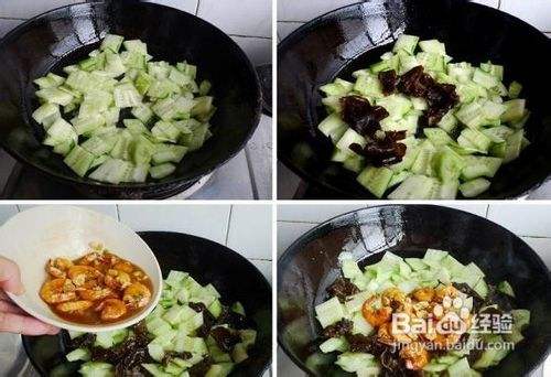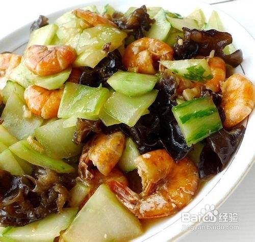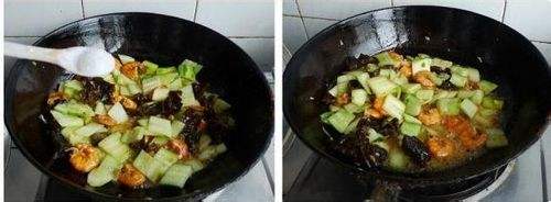 另起油锅,依次倒入黄瓜片、木耳及炒好的大青虾,加盐、鸡精调味,即可出锅食用。